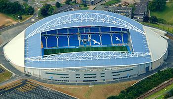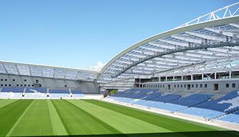 布賴頓社區(qū)球場開放于2011年5月。從開始時起,該球場的設(shè)計就留有擴建余地,并且早在2011年12月,就制定了擴建計劃。2012年初,布賴頓獲得規(guī)劃許可,并且在2012-13賽季開始之前,新增5,000個座位,在2013年初,再次增加3000個座位,這使得該球場的容量增至3.05萬個座位。該球場的主要特征是宏偉的波浪拱形鋼制頂棚結(jié)構(gòu),該設(shè)計意在襯托周圍的石灰?guī)r山巒。主看臺上方的頂棚是半透明的天藍色,再加上可以反光的銀色墻面覆層,進一步強化了自然光線。由于采用最新設(shè)計,頂棚重量僅為101千克/平方米,從而成為這種形式的大跨度頂棚的行業(yè)標桿。該球場在設(shè)計上達到最高環(huán)保標準,獲得BREEAM(英國建筑研究院環(huán)境評估方法)“非常好”評級。這一點的實現(xiàn)有賴于三點:通過減少建筑材料的數(shù)量,盡量減少二氧化碳排放量;優(yōu)化絕緣標準;以及盡量減少能源消耗和廢物產(chǎn)生。整個球場共用去4200噸結(jié)構(gòu)鋼材(2011年數(shù)據(jù))。
