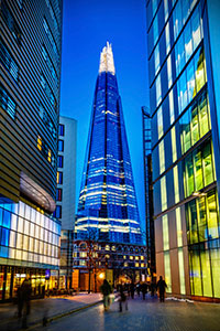 72層高的碎片大廈是一棟矗立在倫敦上空的玻璃覆面的金字塔狀高樓。它建成于2012年,高度為245米,建筑面積11萬(wàn)平方米。本設(shè)計(jì)采用了鋼筋和混凝土的智能組合:底樓至40樓采用了鋼結(jié)構(gòu),41至69樓采用混凝土作為框架材料,之后設(shè)計(jì)再恢復(fù)到鋼材。建筑所需的1.2萬(wàn)噸鋼材是由塔塔鋼鐵英國(guó)北林肯郡斯肯索普工廠提供的。