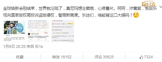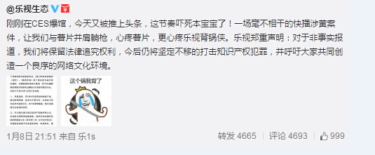 對(duì)此樂視董事長(zhǎng)兼CEO賈躍亭1月8日晚8點(diǎn)多發(fā)微博喊冤:全球煥新會(huì)剛結(jié)束,世界就淪陷了,真想念竇娥,心疼薯片,表明樂視只是舉報(bào)了快播侵權(quán),不該背這黑鍋。