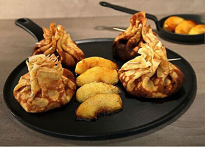形狀像燒麥,外層是可麗餅,里面填充了各種香料和水果,比如香草、草莓、蘋(píng)果等。